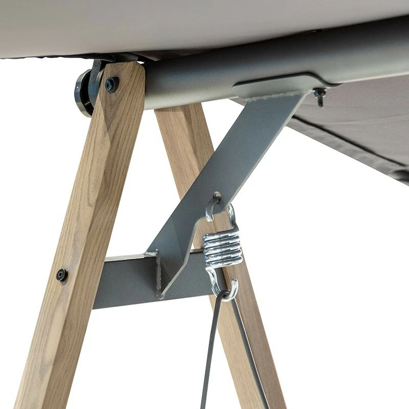L’assise et la toile de toit sont en polyester 180 g/m² et 225 g/m² traité déperlant afin de faciliter l’élimination des pluies fines.