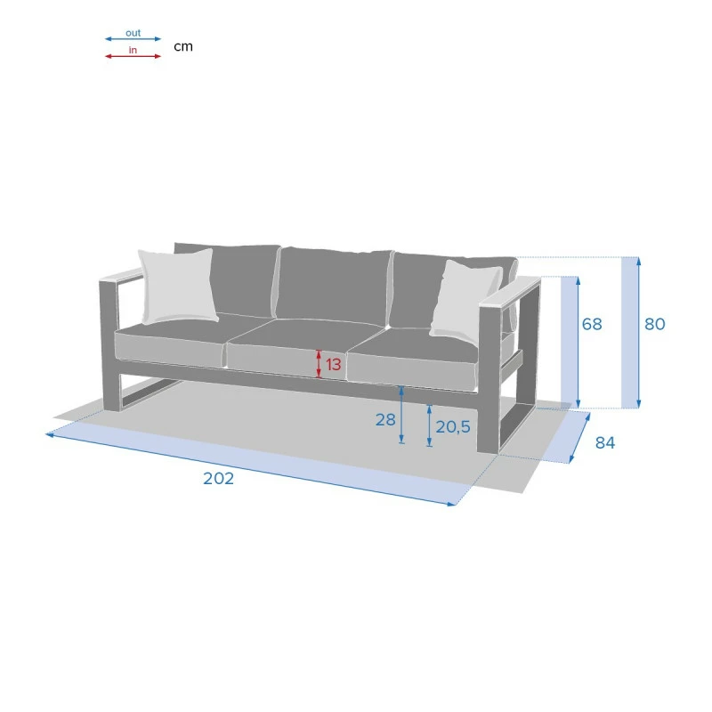 La structure est en aluminium traité époxy antirouille. Les coussins polyester 275 g/m² sont déhoussables pour un entretien facile et traités déperlants permettant à l’eau de glisser sans pénétrer dans la matière.