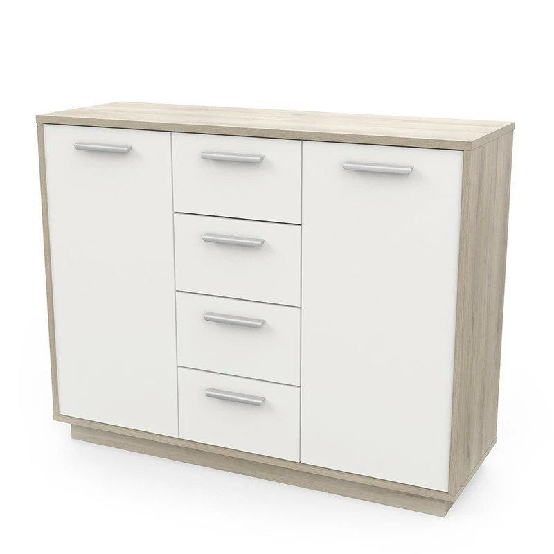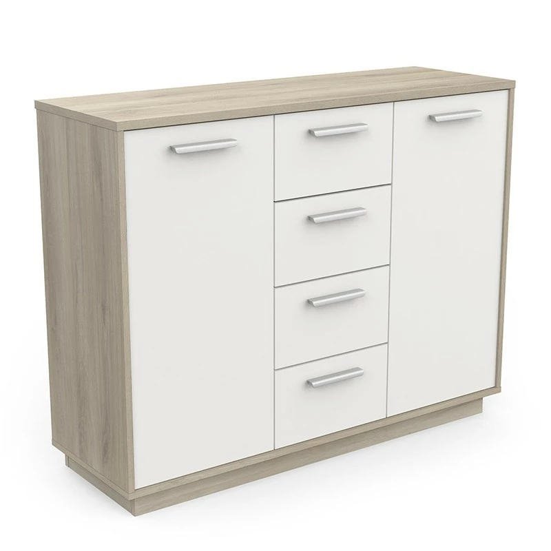 Avec son style épuré, le buffet bas 2 portes 4 tiroirs Léo s’intègre facilement dans un intérieur.