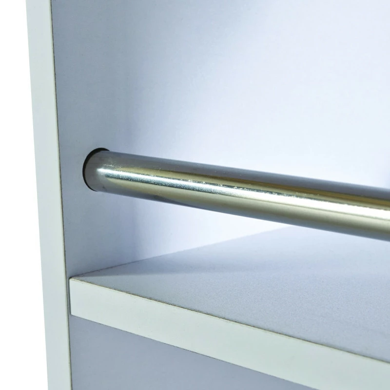 Desserte en panneaux de particules, épaisseur : 15 mm. Revêtement mélamine. Finition BRILLANT. Dessus inox.