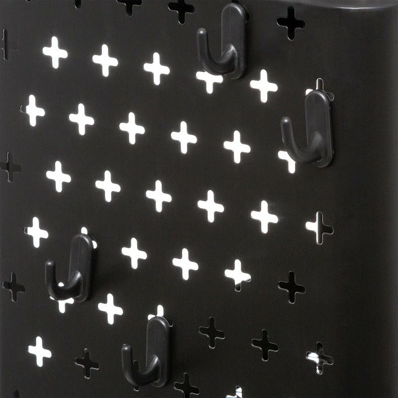Idée astucieuse : crochets à mettre dans l’un ou l’autre des orifices en croix pour accrocher les ustensiles.