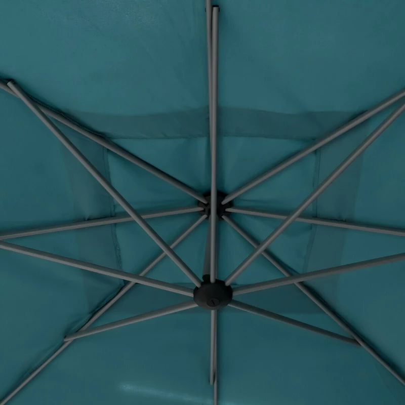 Protégez vous du soleil avec le parasol décentré toile carrée Manoa en coloris bleu canard de la marque Hespéride.