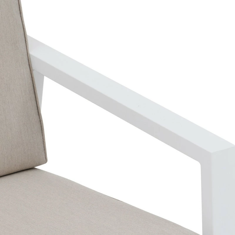 Appréciez le confort et le style du salon de jardin 5 places Pavane de la marque Hespéride en coloris beige ficelle et blanc.