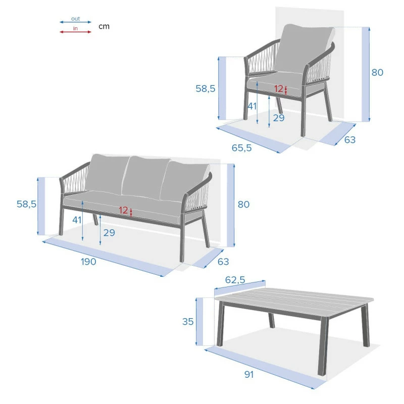 Ses coussins (déhoussables) sont en polyester 230 g/m² traités déperlants. Le plateau de la table est en bois d’acacia certifié FSC recouvert d’un vernis protecteur.