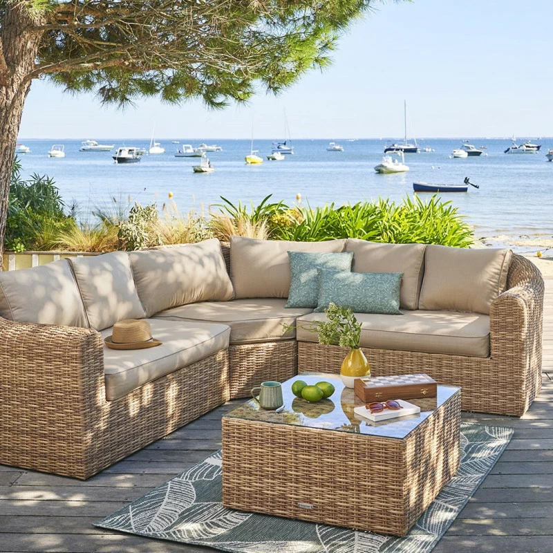 Pratique, légère et chaleureuse, optez pour la table basse carrée extérieure Mooréa en coloris savana de marque Hespéride.